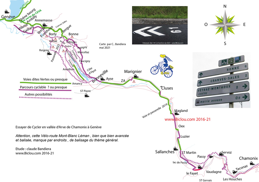 Cette fois-ci, nous avons suivi le parcours, non pas V-61 , côté Ouest de l'Arve, mais le parcours longeant l'Arve côté EST : depuis Bonneville , chemin large type Gravelle assez bien praticable, mais non indiqué , claudio se dit : 'oui c'est bien', mais surprise, 1 km avant Contamines sur Arve, grosse flaque d'eau (20 cm de profond), passage difficile sur le côté au risque de chute, impossible pour des familles .. prévoir remblais ! au moins.